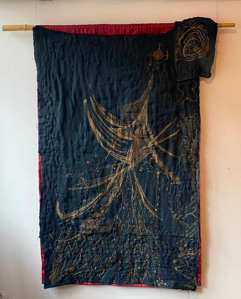 Burung Laut verbeeld de fregatvogel,. Binnen de centraal Molukse cultuur geloven we dat de zielen van onze voorouders terugkeren naar de fregatvogels die cirkelen boven de wereldzeeën en de baai van Ambon.  De fregatvogel is getekend met batikwas en goudborduursel.